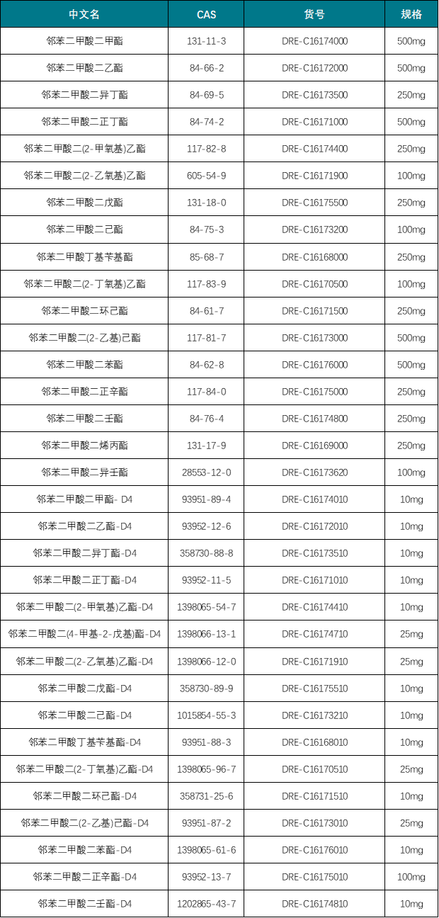 参考GB 5009.271-2016 食品安全国家标准 食品中邻苯二甲酸酯的测定,LGC(Dr. Ehrenstorfer)可提供如下产品: